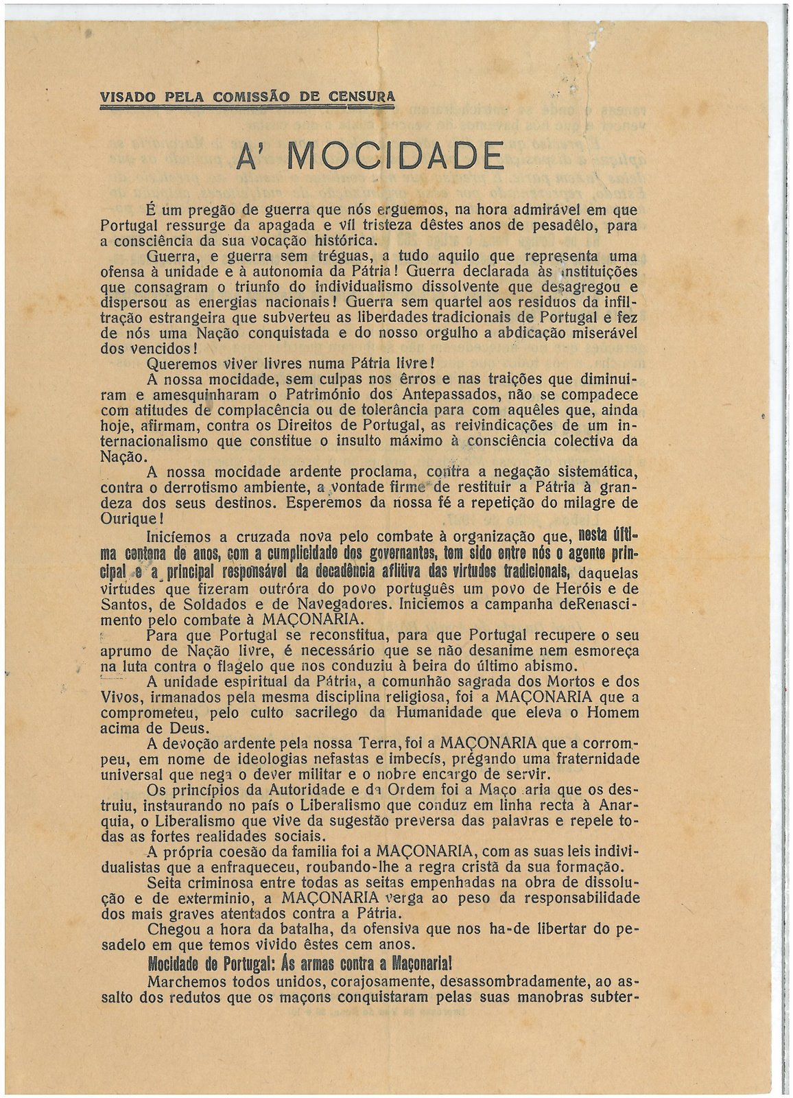 CARTA PARA A MOCIDADE PORTUGUESA CONTRA A MAÇONARIA (1927) Uma preciosidade histórica que ilustra as relações entre o regime politico Português antes do 25 de Abril e a Maçonaria. Uma proposta interessante de reflexão ![]() ![]() |